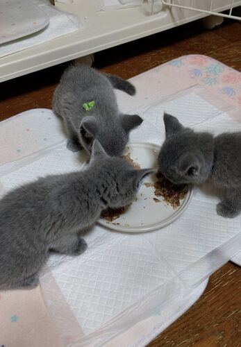 天ちゃんの子猫ちゃんたち、よーく食べます。 一番速く食べるのは、右側の②君。離乳前はオッパイのよく出る 場所にありつけなかったので、少し小さめでした。 こういう子は離乳になるとよーっく食べてくれます。 そして、今や①子ちゃんを追い越し、③君とおん…